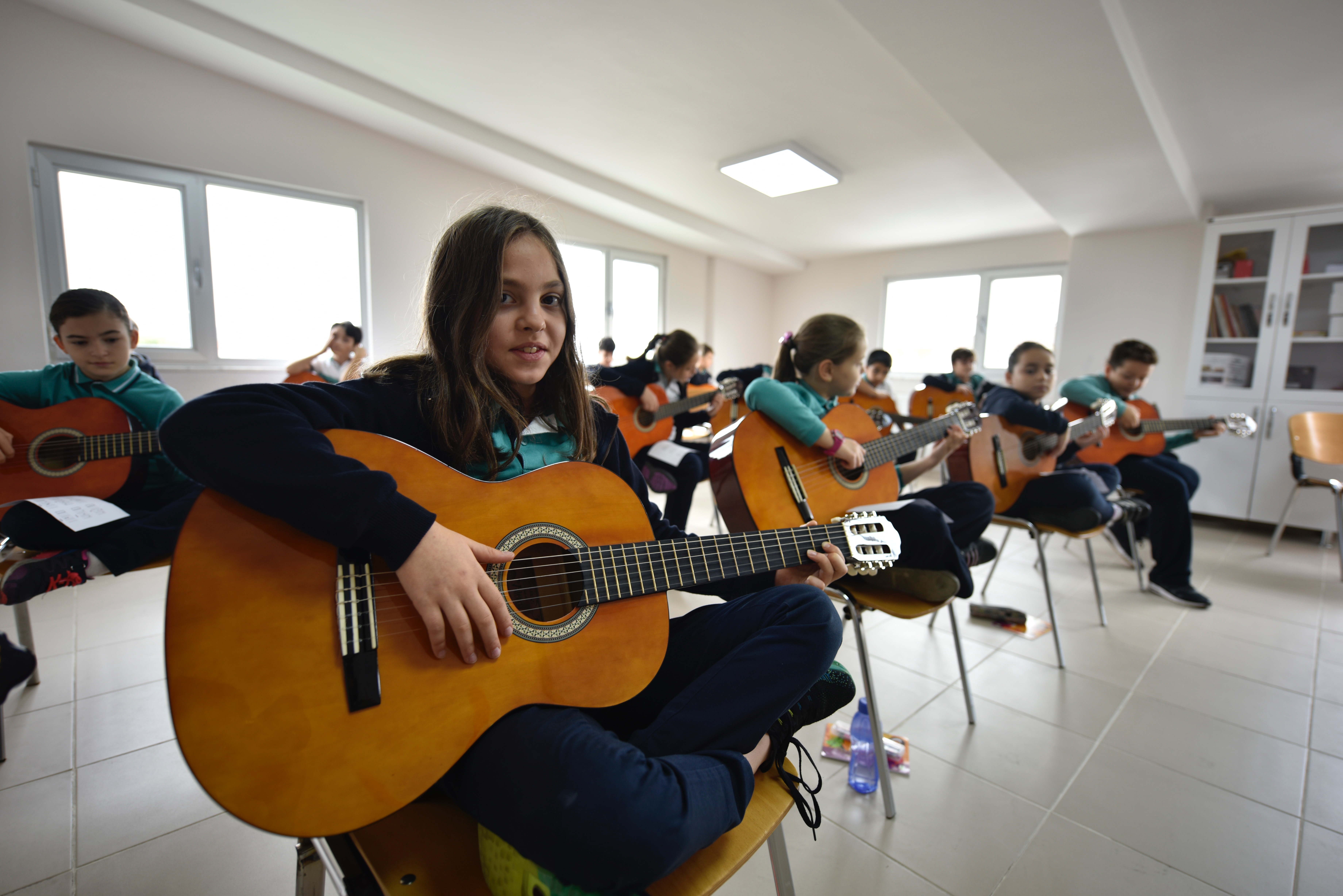 Gitar eğitiminin temelinde öğrencilerimizin müzikal kültürünü arttırmayı amaçlamanın yanı sıra onları sosyal hayatlarında bireysel ve grup çalışmalarına hazırlamayı hedefliyoruz. Liseye geldiğimizde artık öğrencilerimiz notalara hakim enstrüman çalmayı bilen bireyler olarak karşımıza çıkarlar. Lise Kademesi 9.sınıflarımızda Türk Halk Müziği koro repertuar çalışması yaparak hem kültürümüzü unutmuyor hem de türkülerimiz hakkında bilmediklerimizi öğreniyoruz. 10.sınıfta boomwhackers müzikal boruları ile ritim, koordinasyon ve grup halinde müzik yaparak güncel ve hit şarkıları çalıyoruz. 11.sınıflarda ise ilk çağdan günümüze kadar olan müzik serüvenini inceliyor genel kültürümüzü geliştirerek müzikal anlamda hayata hazır bireyler yetiştiriyoruz.