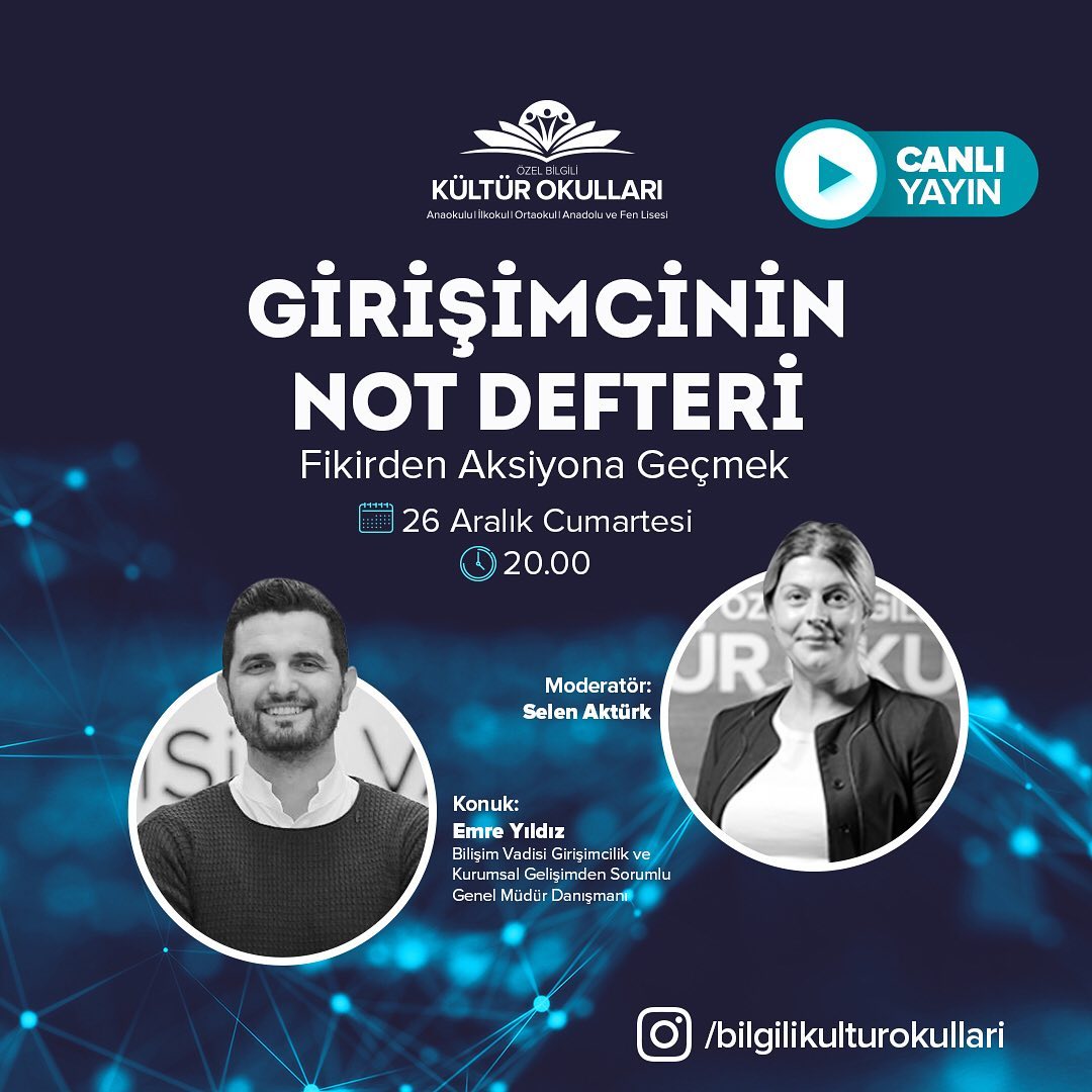Girişimcinin Not Defteri programımızda konuğumuz Bilişim Vadisi Girişimcilik ve Kurumsal Gelişimden Sorumlu Genel Müdür Danışmanı Emre Yıldız oldu. 26 Aralık saat 20.00'da Instagram sayfamızdan gerçekleştirdiğimiz canlı yayınımızda Yıldız, girişimcilikle ilgili merak edilen soruları cevapladı.