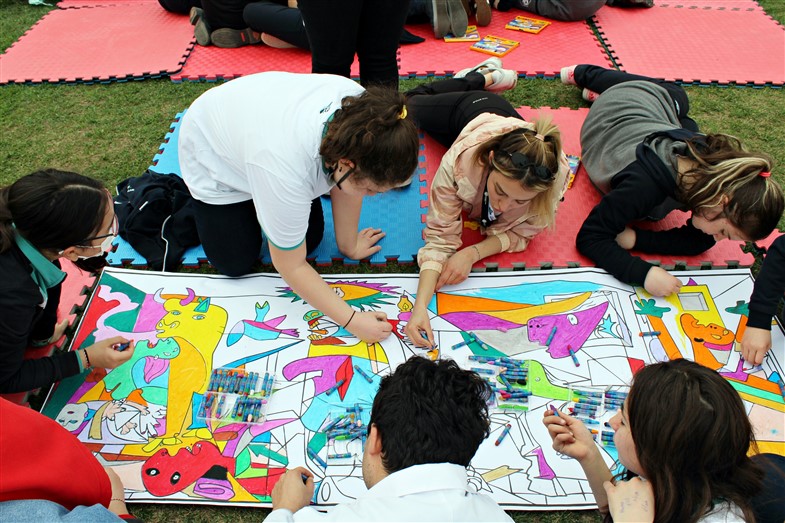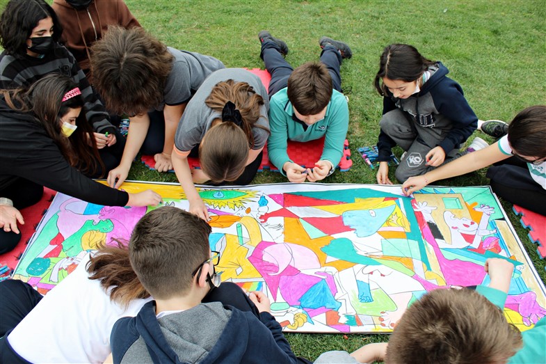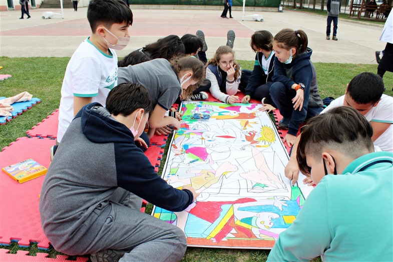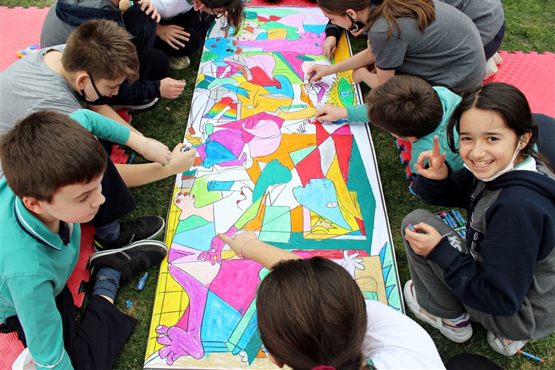 “Sanat Bahçede” etkinliklerimiz devam ediyor; resim atölyelerine sığmayan öğrencilerimiz ünlü Ressam Pablo Picasso’nun 1937 yılında yaptığı İspanyadaki  “İç Savaşı” anlatan “Guernica Tablosu”nu hep birlikte okul bahçesinde renklendirdiler.