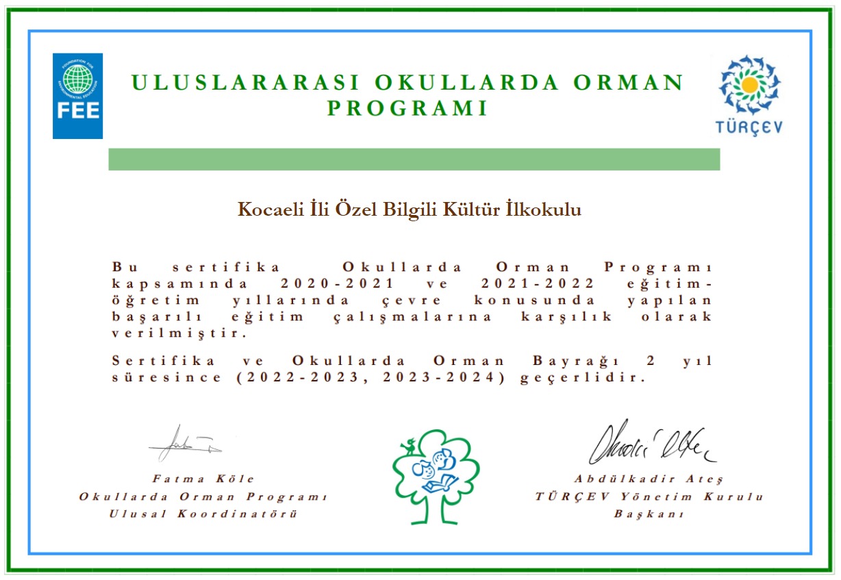 Birleşmiş Milletler FEE çatısı altında, Özel Bilgili Kültür Okulları İlkokulu olarak 1 yıl boyunca yürüttüğümüz “Okullarda Orman” projesinde başarı sertifikası ve bayrağımızı almaya hak kazandık. Öğretmenlerimizin koordinatörlüğü ile yürütülen projede, öğrencilerimize orman farkındalığını oluşturarak çevre duyarlılığı kazandırdık. Emeği geçen tüm öğretmen ve öğrencilerimize teşekkür ederiz.