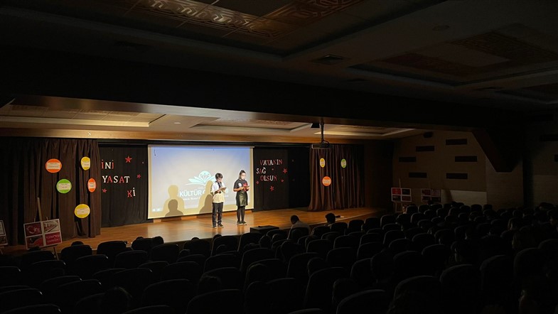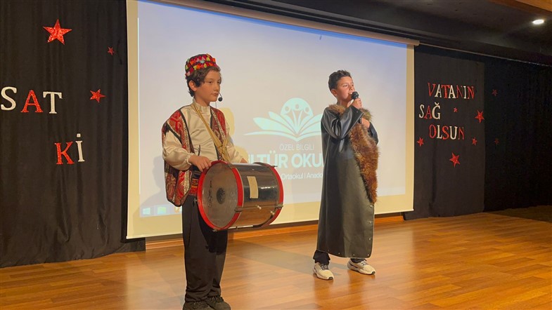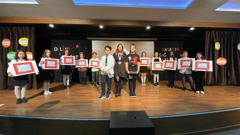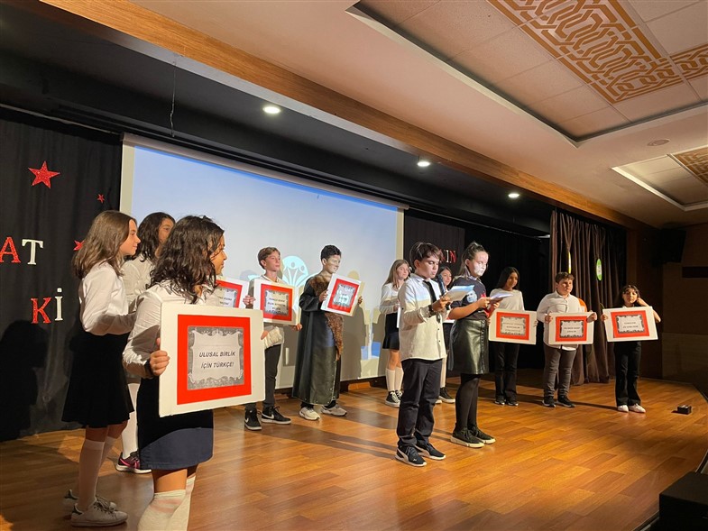Dilimizin, yani millî kimliğimizin bayramı 26 Eylül “Dil Bayramı”nın 90. yıl dönümünü kutlamak amacıyla Türkçe Zümresi olarak düzenlediğimiz programımızda; okunan şiirler, hazırlanan sunumlarla günün anlam ve öneminin üzerinde dururken diline, bayrağı gibi sahip çıkması gereken bir nesil yetiştirmek için “Türkçem benim ses bayrağım.” sloganlarıyla yürüyüşler düzenledik. Dilinin başka dillerin boyundurluğuna girmemesi gerektiğini bilen bir nesil olarak öğrencilerimiz yaptıkları pankartlarla sergi açıp tüm öğrenci gruplarımıza örnek olmaya çalıştılar.