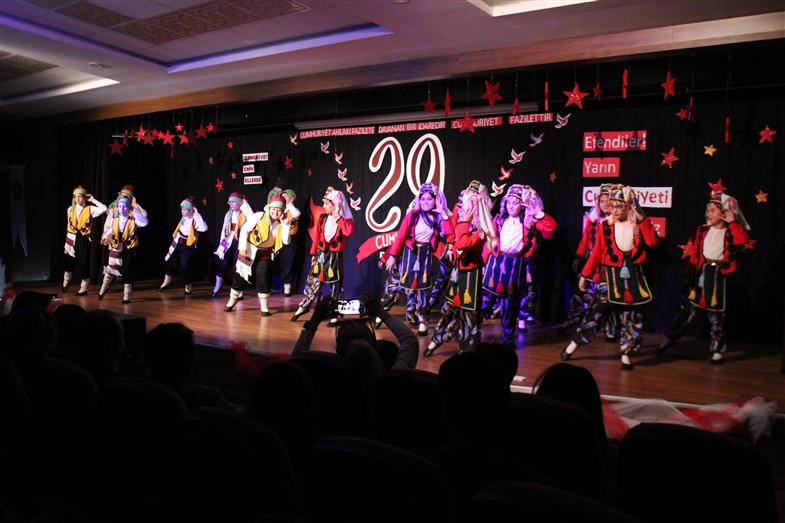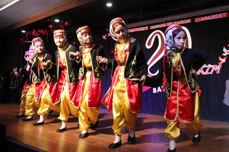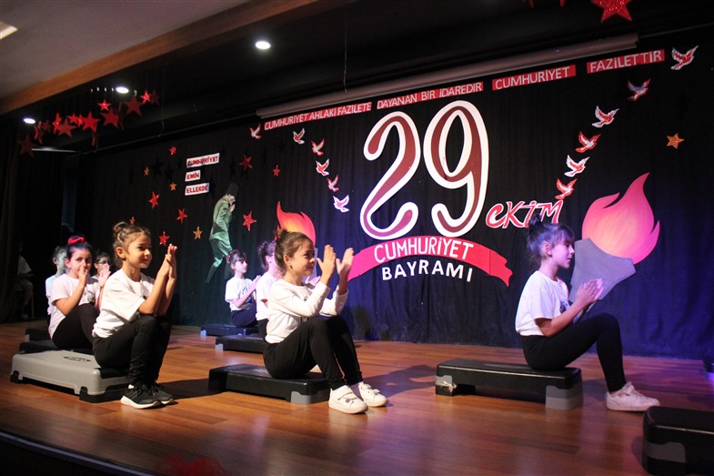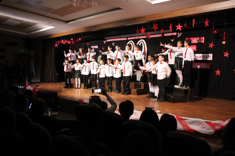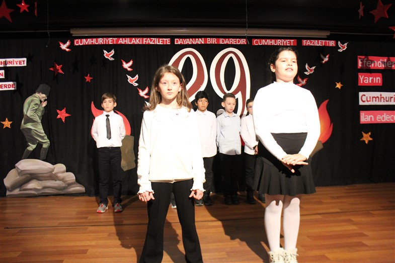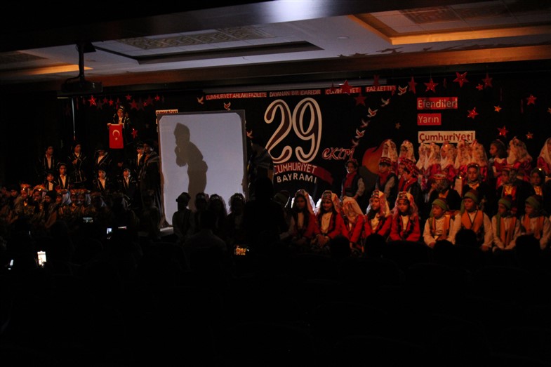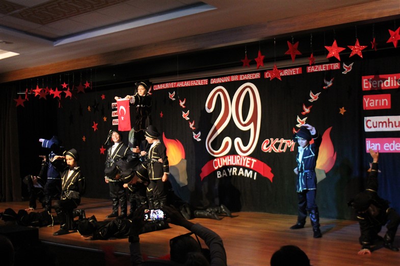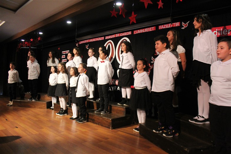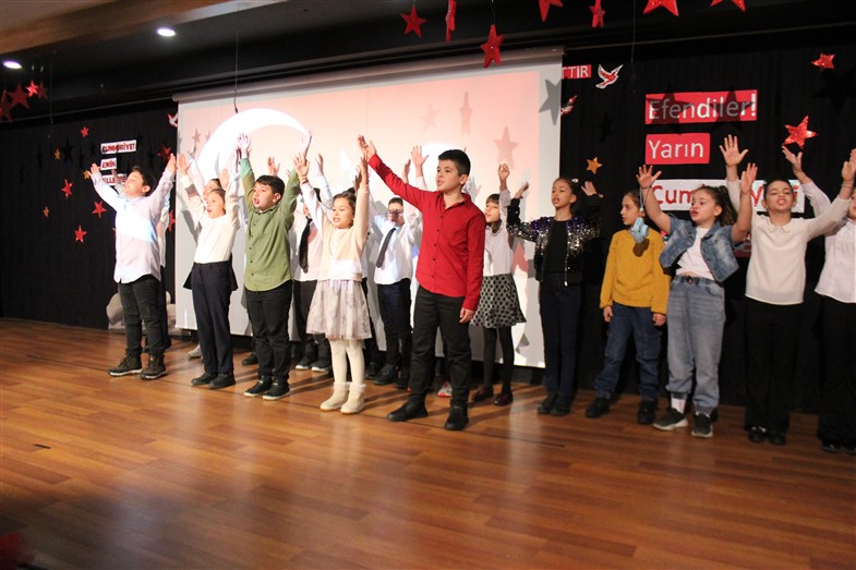 Cumhuriyetimizin kuruluşunun 99. Yıl dönümünü öğrencilerimizin hazırladığı muhteşem bir törenle kutladık. Okulumuzun konferans salonunda gerçekleşen törende öğrencilerimiz başarılı performanslar sergiledi. Saygı duruşu ve İstiklal Marşı ile başlayan törende öğrencilerimiz tiyatro, dans gösterisi ve koro performanslarını arkadaşları ve velilerin beğenisine sundular. Oldukça başarılı performansların coşku ile sergilendiği törende zaman zaman duygu dolu anlar yaşandı. Ulu Önder Gazi Mustafa Kemal Atatürk’ün bizlere emaneti olan Cumhuriyet’in 99. Yılı hepimize kutlu olsun.